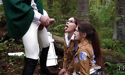 Attack on titan. Messy threesome fellatio for commander in the forest